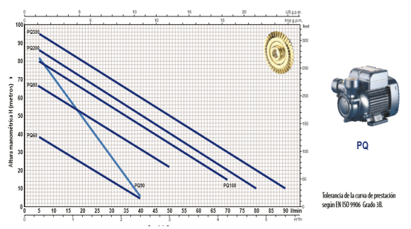 - La bomba trabaja eficientemente hacia ambos lados de la curva, pero su mejor punto de eficiencia es 40 MCA / 2 GPM