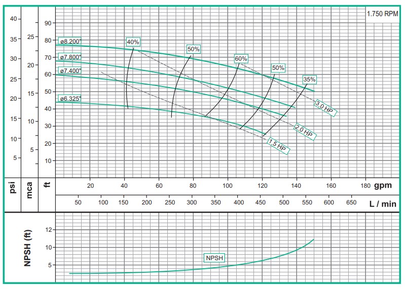 - ** El caudal (Q) máximo se logra con la válvula de paso totalmente abierta (gpm=galones por minuto)