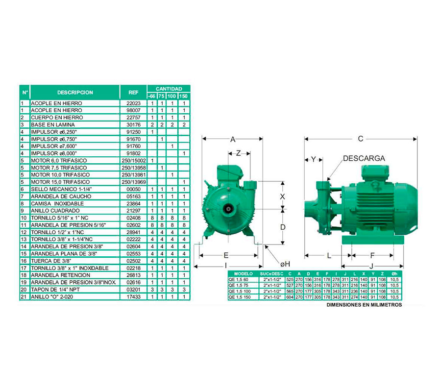MODELO | Ø SUCCIÓN | Ø DESCARGA | POTENCIA