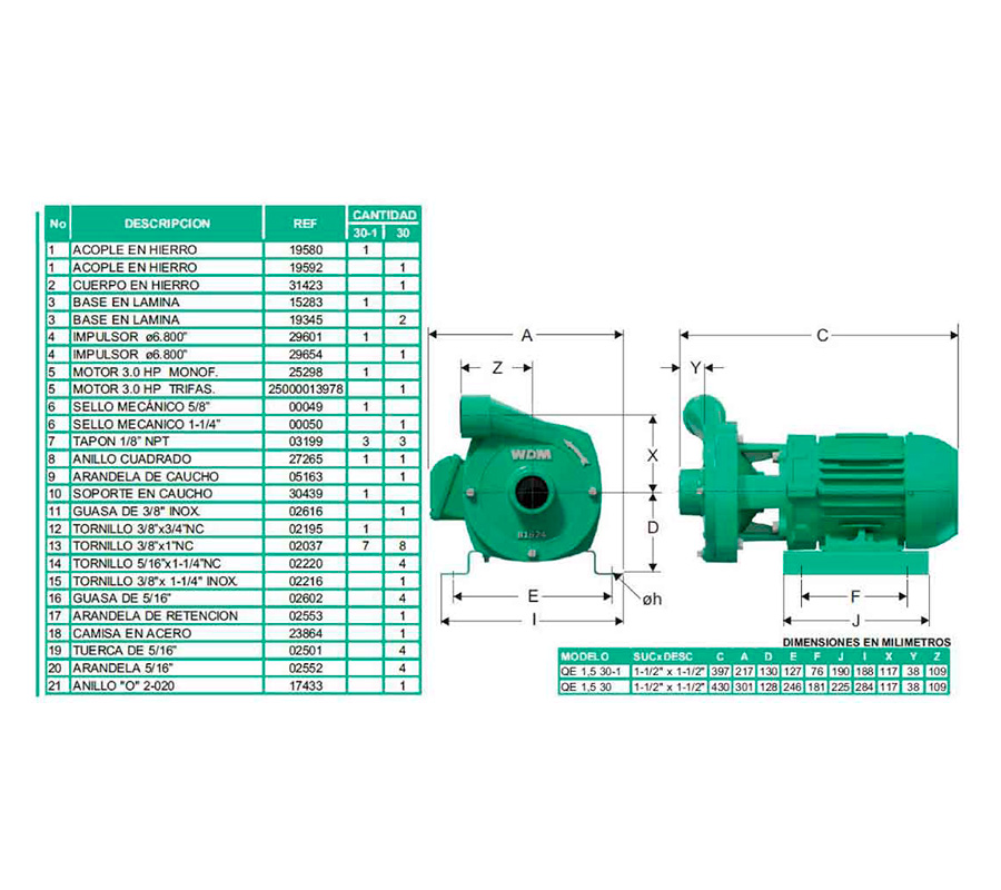 MODELO | Ø SUCCIÓN | Ø DESCARGA | POTENCIA