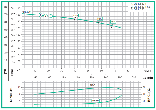 - ** El caudal (Q) máximo se logra con la válvula de paso totalmente abierta (gpm=galones por minuto)