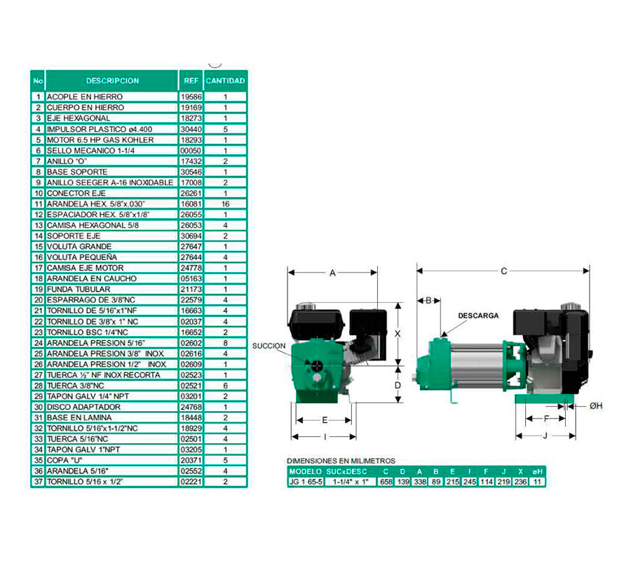 MODELO | Ø SUCCIÓN | Ø DESCARGA | POTENCIA (hp) | ETAPAS | H MAX (mca) | Q MX (gpm) |