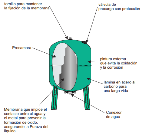 * El tanque viene con una válvula de precarga de aire el cual debe ser calibrado con una presión de 2 PSI por debajo de la presión de arranque del equipo.