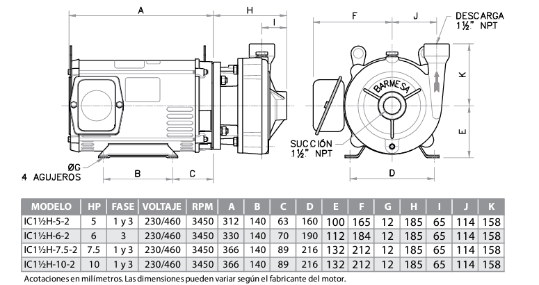 61070354 | IC1½H 10 2 | Bomba Centrífuga Alta Presión | Barmesa Pumps | Motor Eléctrico