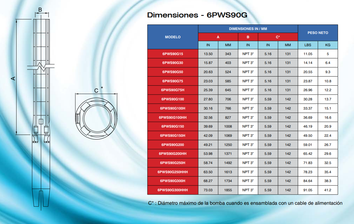 Sé el primero en valorar “Bomba hidraulica | Pozo profundo 6″ | PEARL | En acero inoxidable AISI 304 | Ref 6PWS 90G250HHH-D3M6* | 25 | 3″ ESTANDAR (4″ PEDIDO ESPECIAL) | 6″ | 22”