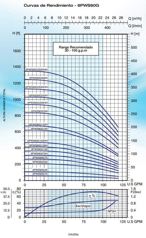 Bomba hidraulica | Pozo profundo 6″ | PEARL | En acero inoxidable AISI 304 | Ref 6PWS 90G250HHH-D3M6* | 25 | 3″ ESTANDAR (4″ PEDIDO ESPECIAL) | 6″ | 22