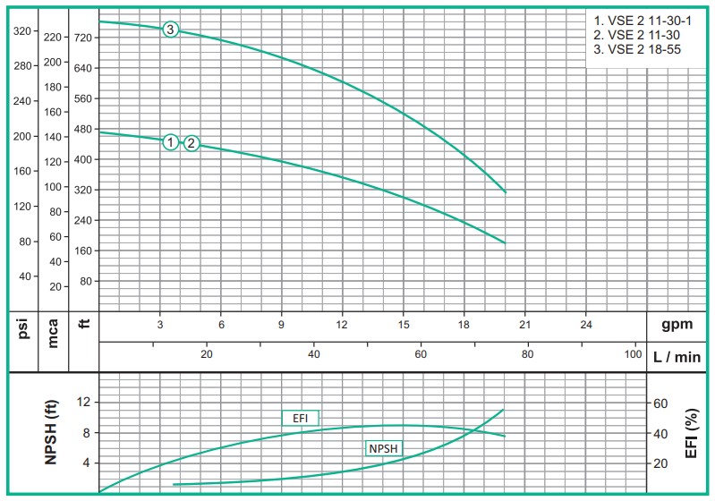 - H Max= 143 (mca= metros columna de agua). La altura (H) máxima se logra con la válvula totalmente cerrada.