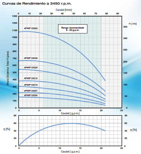 Electrobomba sumergible tipo lapicero | De drenaje de aguas limpias | Pozo profundo 4″ | PEARL | Ref 4PWP13G 30C16P3C | 3,0 | 220/1 | 16,1 | 1.1/4″ | 21