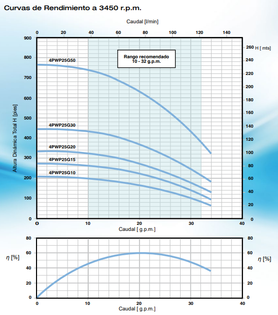 Electrobomba sumergible tipo lapicero | De drenaje de aguas limpias | Pozo profundo 4″ | PEARL | Ref 4PWP25G 10C16P2 | 1,0 | 220/1 | 7,6 | 1.1/4″ | 7