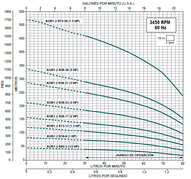 - Rango de flujo: 0.50 – 1.33 lps / 30 – 80 lpm