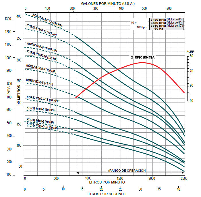- Rango de flujo: 13.3 – 41.6 lps / 800 – 2,500 lpm