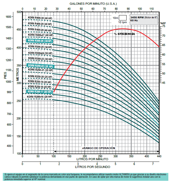 - Rango de flujo: 1.6 – 7.3 lps / 100 – 440 lpm