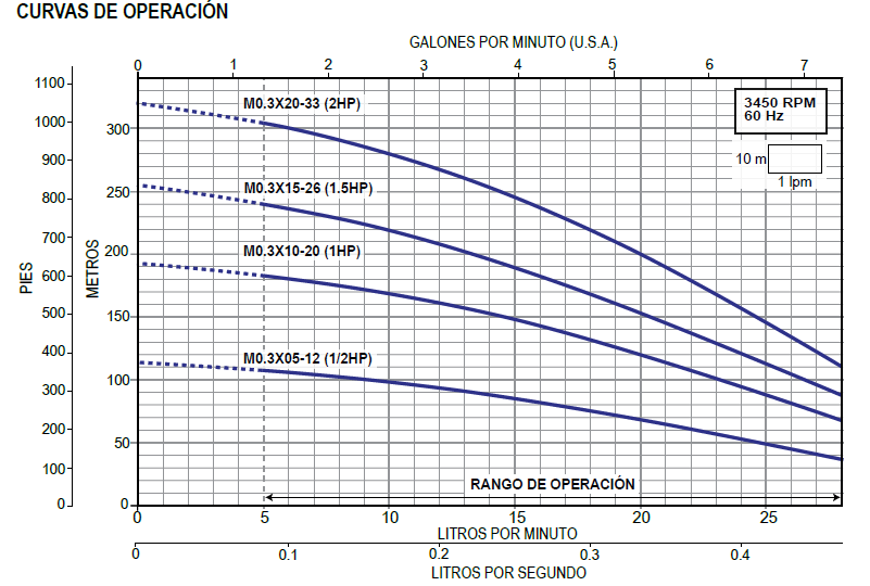 • Rango de flujo: 0.08 – 0.46 lps / 5 – 28 lpm