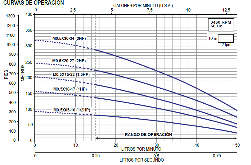 • Rango de flujo: 0.25 – 0.8 lps / 15 – 50 lpm