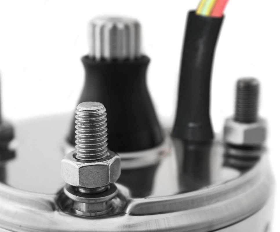 - Sistemas de baleros superior e inferior muy robustos, construidos en acero inoxidable y lubricados en aceite