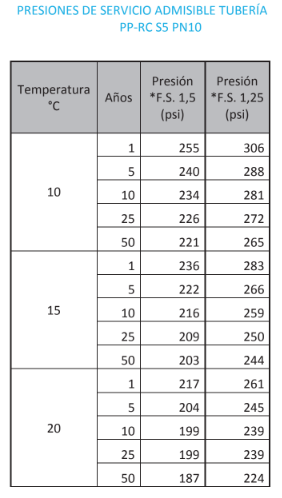 Los datos suministrados cumplen con la norma UNE EN ISO 15874 y la NTC 4897. Estos corresponden a las presiones de trabajo admisibles aplicando un factor de seguridad de 1,5* y 1,25*.