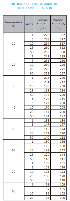 Los datos suministrados cumplen con la norma UNE EN ISO 15874 y la NTC 4897. Estos corresponden a las presiones de trabajo admisibles aplicando un factor de seguridad de 1,5* y 1,25*.