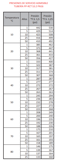Los datos suministrados cumplen con la norma UNE EN ISO 15874 y la NTC 4897. Estos corresponden a las presiones de trabajo admisibles aplicando un factor de seguridad de 1,5* y 1,25*.
